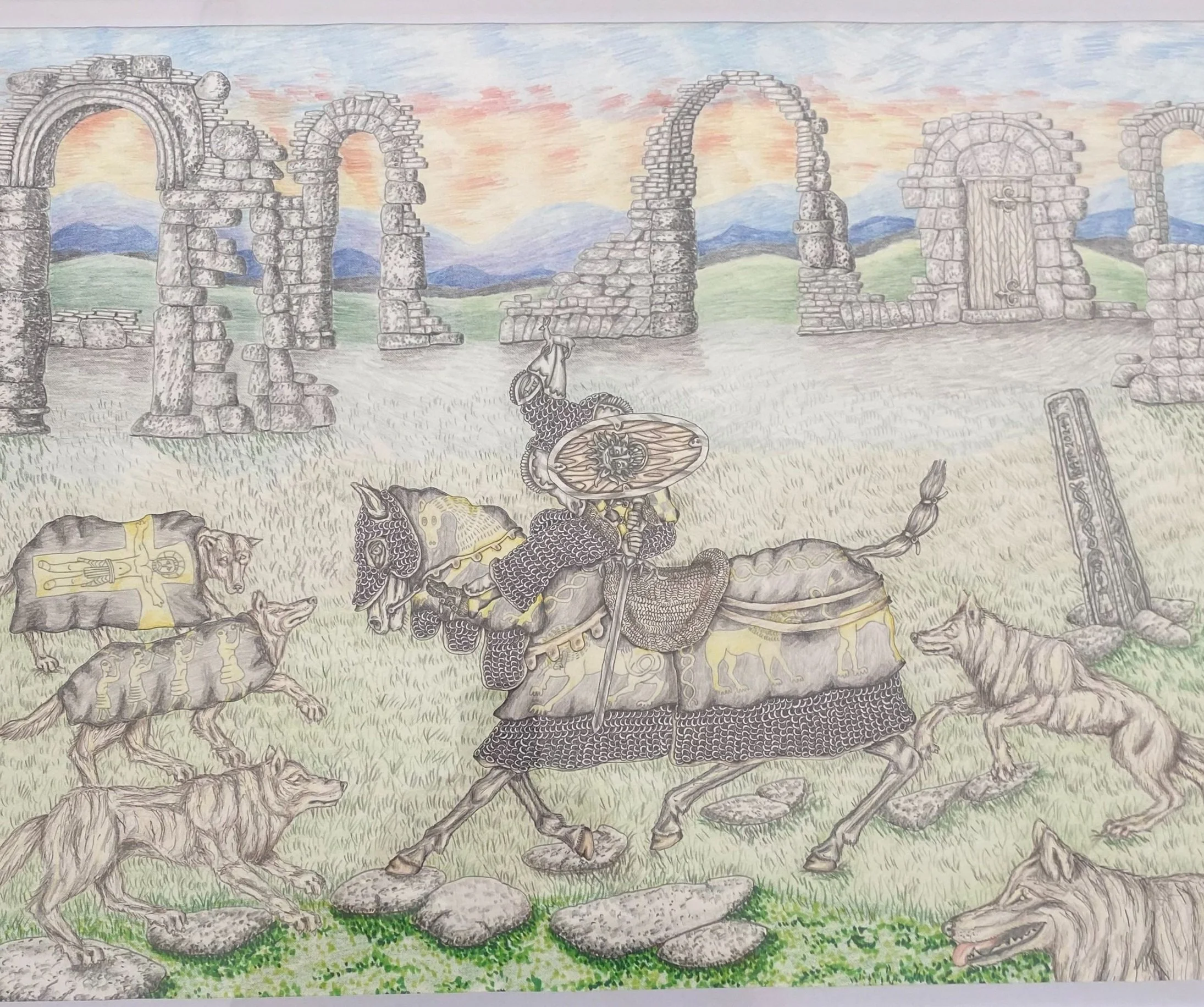 This yellow clad warrior inspired by Celtic and Post Roman origins. After the Romans left England they where left to fend for themselves. The white wolf with his friendly greeting meets his master.